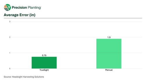 The first step was exploring any differences in performance between TrueSight and the abilities of an experienced combine operator. There was some variation between field conditions and operators tested, but the trend was clear: TrueSight had a standard deviation (average error from the center of the row) of 0.5" to 1", while manual steering resulted in a standard deviation of 1.9".